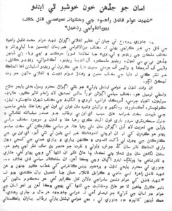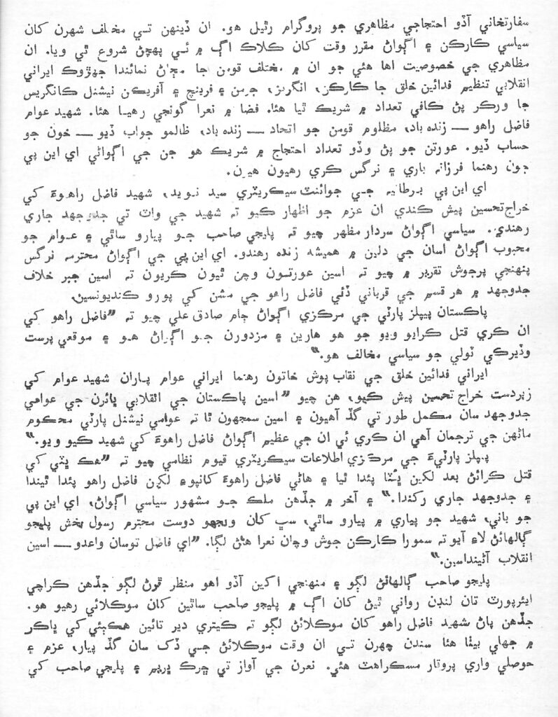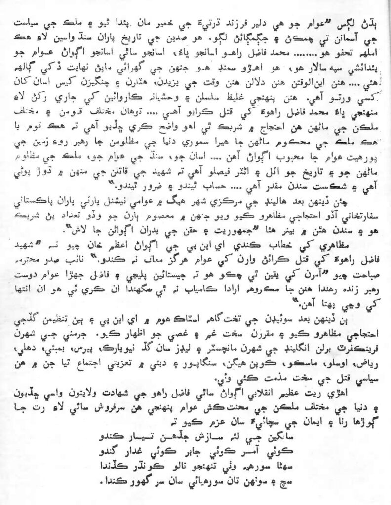 As soon as the assassination news of great revolutionary leader Shaheed-e-Awaam Muhammad Fazil Rahoo reached in Karachi, teleprinters of different international news agencies and Radio T.V reporters of several countries came into movement. Next day when including B.B.C London, Radio Moscow, All India Radio, Aakashwani, Radio Kabul, voice of America and voice of Germany & world’s many other radio stations broadcasted that tragic news, as a result the blood of all those human-friendly firms and revolutionaries started blistering.